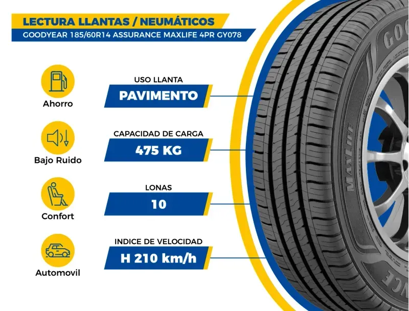 Descripción Larga | Llanta Auto 185/60R14 Assurance Maxlife 4PR GY078 Goodyear